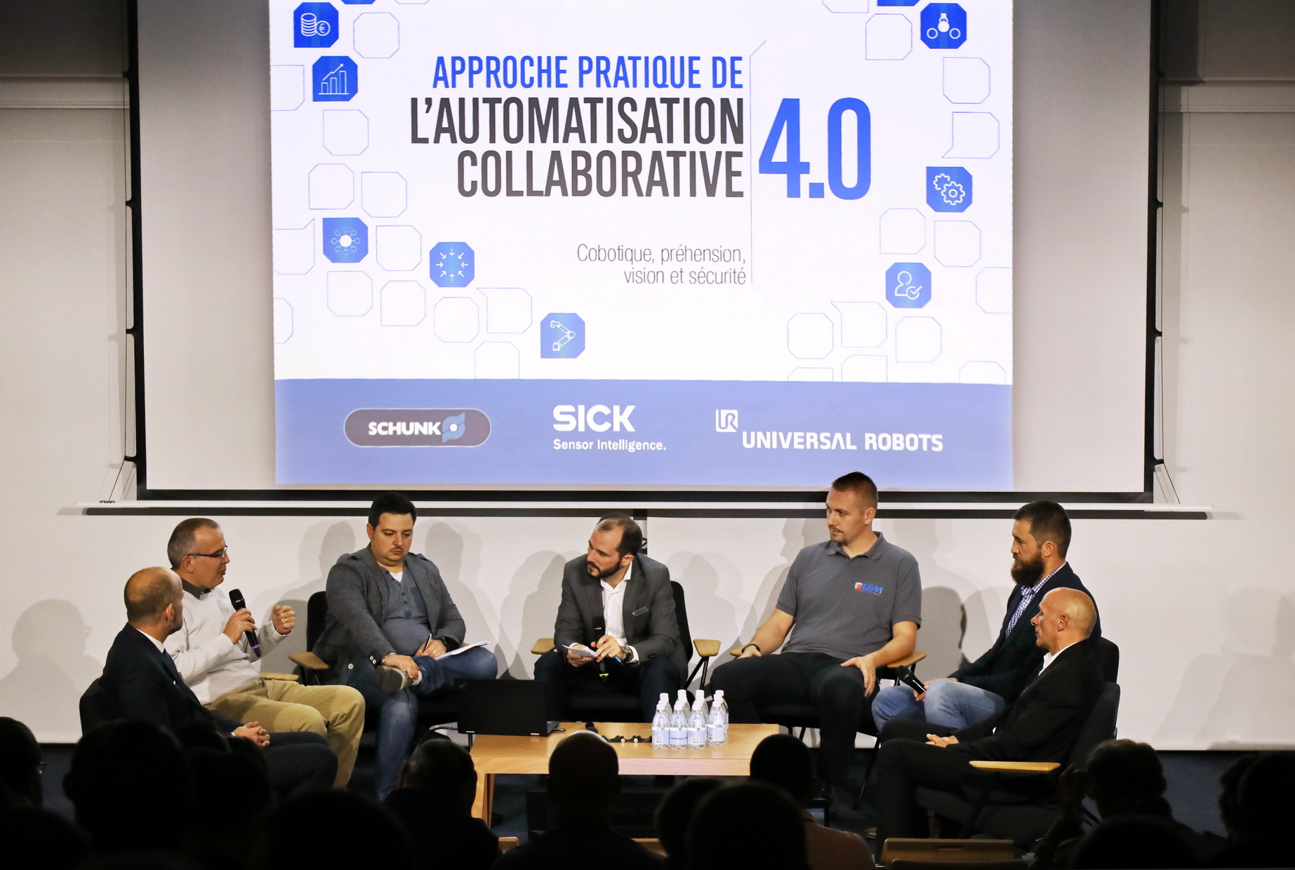 Enfin, les invités ont pu assister à la table ronde où nos clients Jacquemet, Goulard et Gindre prenaient part. Merci à eux pour leur témoignage et retour d’expérience. La séance d’échanges avec les invités a permis de mettre en évidence les avantages de l’intégration des robots UR dans les PME françaises, à savoir, la rapidité du retour sur investissement, la polyvalence et la facilité de programmation des robots.