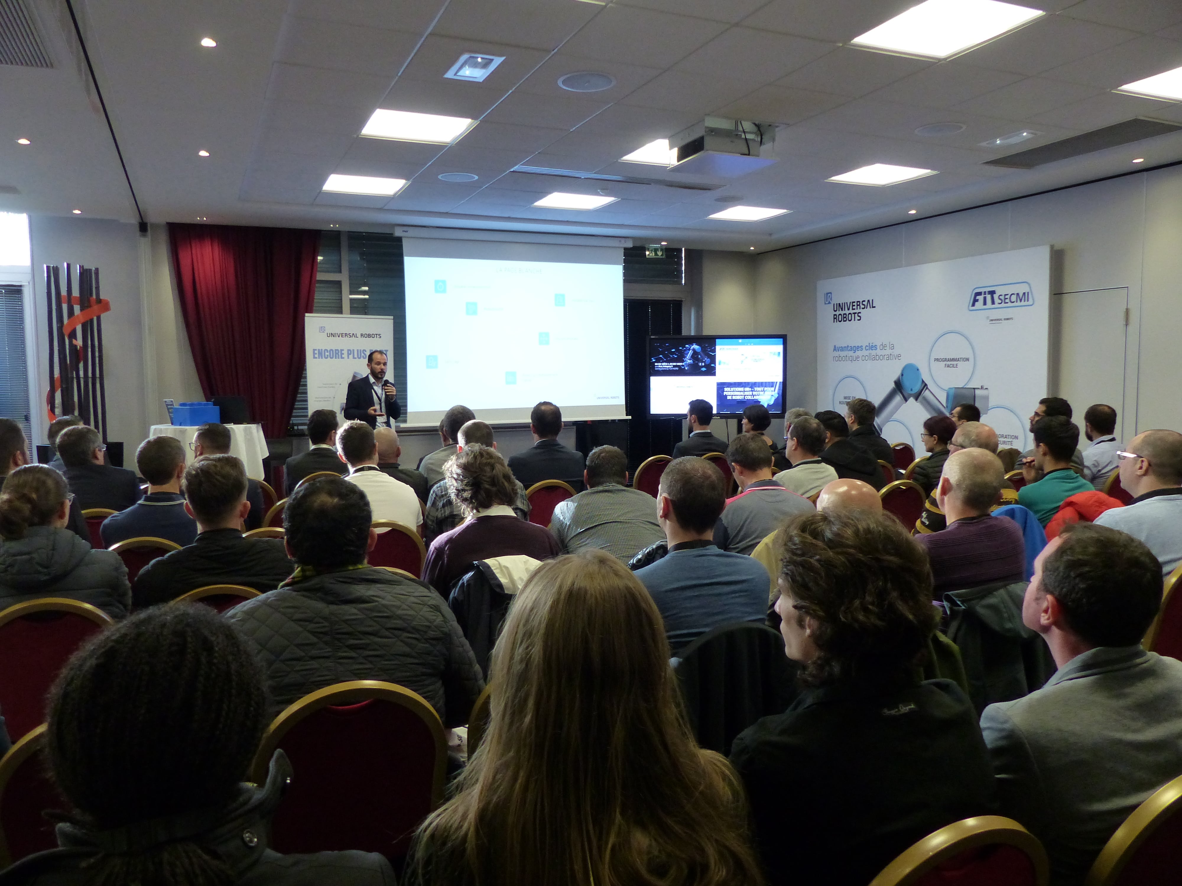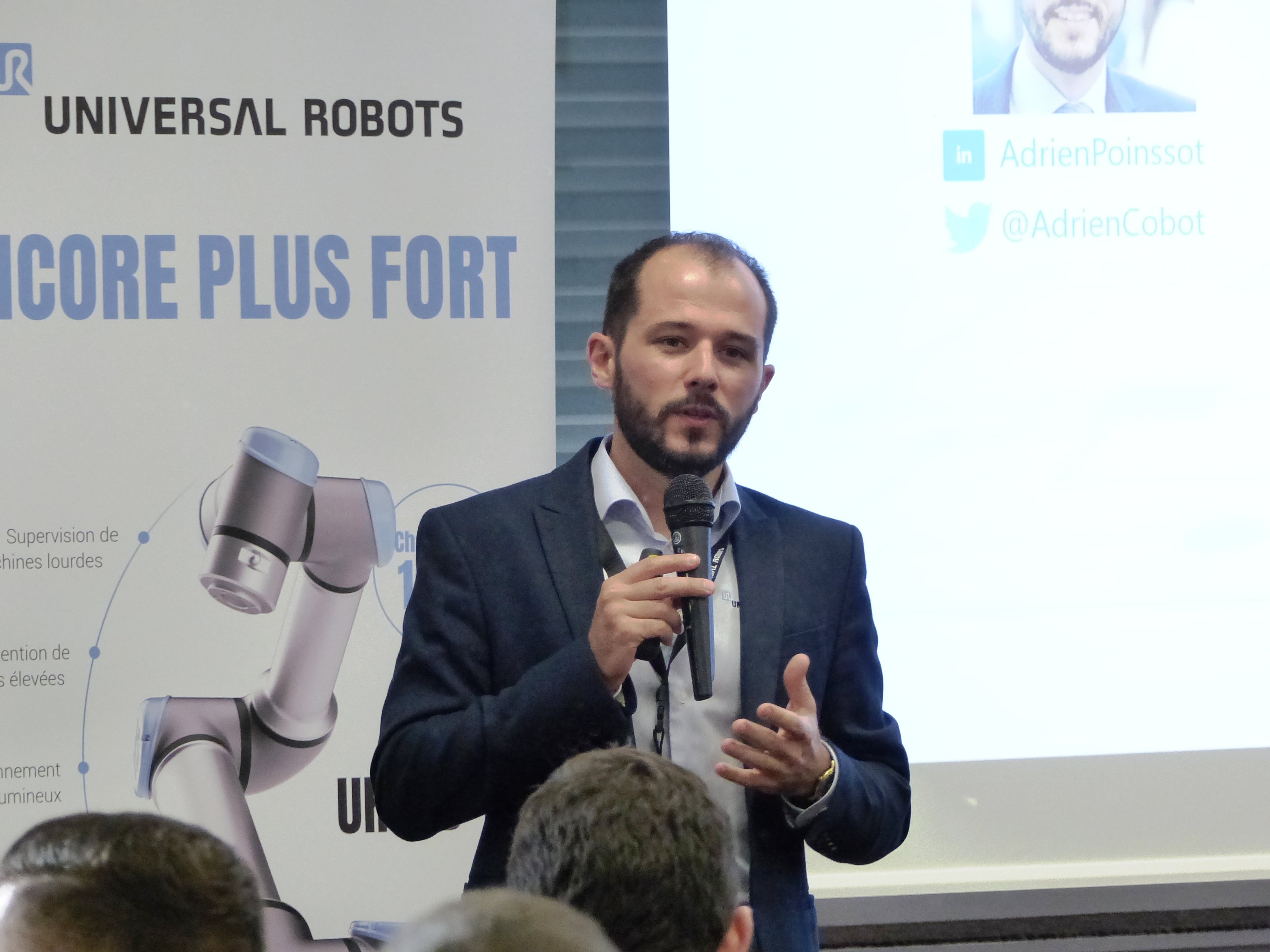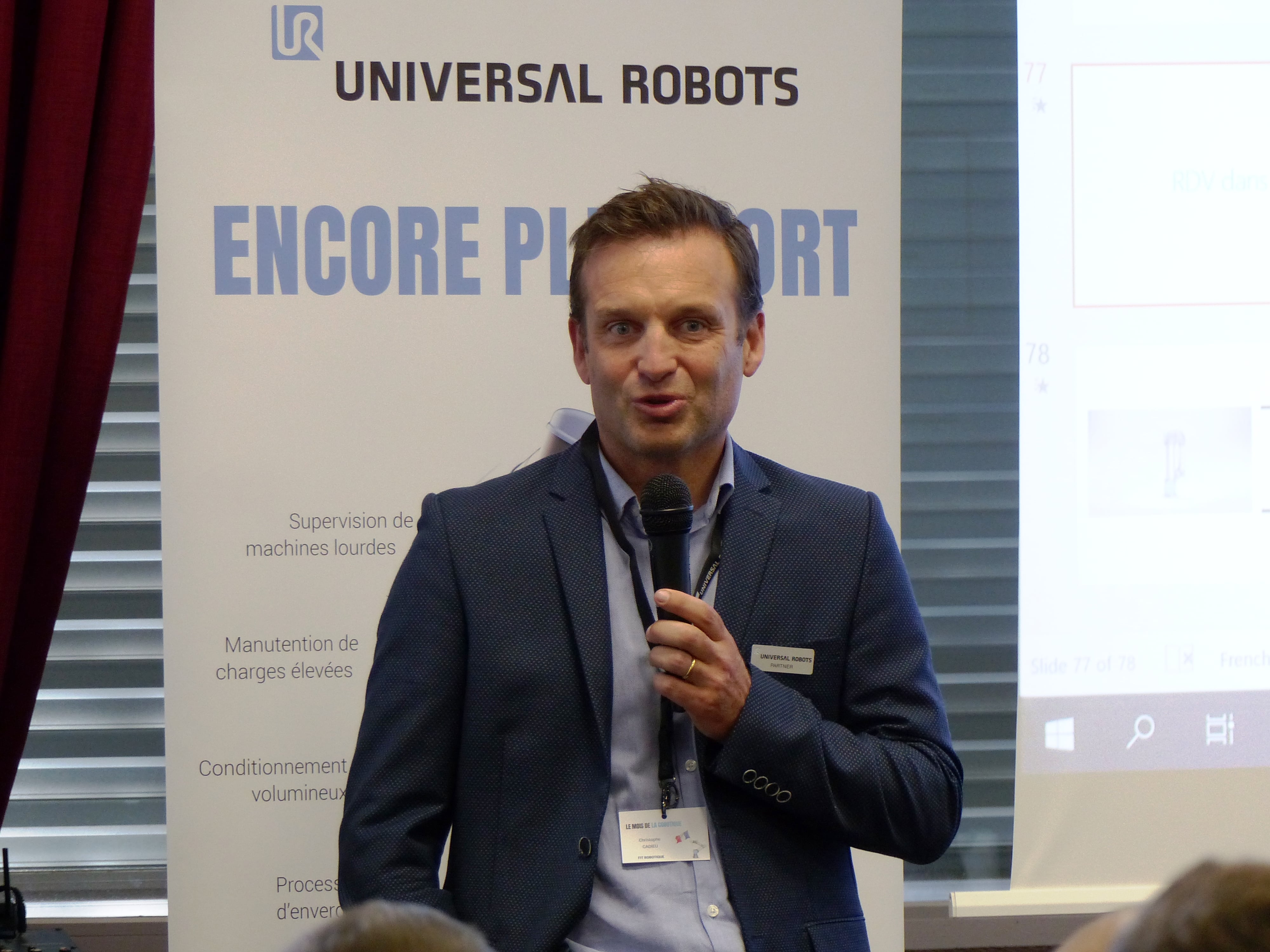 Christophe CADIEU (responsable activité robotique chez FIT ROBOTIQUE) a ensuite pris la parole pour présenter la société, distributeur de robots UR dans le quart sud est de la France. Nous en profitons pour vous annoncer l’arrivée de notre nouveau collaborateur, Stéphane Barthassat qui aura pour rôle de vous accompagner sur la phase d’avant projet pour les sujets de cobotique.